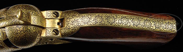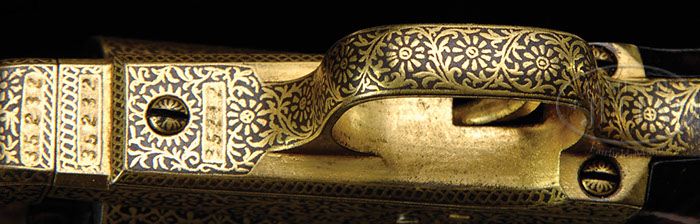 Additional Information: All damascening done in 22k gold wire work in 3 distinct patterns. Bbl & backstrap decorated in complex foliate vine & scrollwork w/flowerettes; receiver and chambers area in fine foliate reticulations only; cyl in connecting circular patterns w/linear foliations. Consignor has owned this pistol since its purchase from Julia’s in 1994. RARE CASED DAMASCENED COLT MODEL 1851 LONDON NAVY PERCUSSION REVOLVER. SN 35232. Cal. 36. Circa 1855. Usual configuration with 7-1/2″ oct bbl, pin front sight and 1-line address “COL. COLT. LONDON” with spears. Frame is marked with a small “COLT’S PATENT”. Damascened steel trigger guard & backstrap contain a 1-pc varnished walnut grip with matching SN in backstrap channel. Entire revolver including cyl, rammer & handle, wedge, hammer, trigger guard & backstrap are beautifully damascened with intricate vines and flowerettes in heavy gold and a dark brownish metal background. Screw heads are also damascened. Left side of bbl lug & cyl have British proofs. Accompanied by an orig English mahogany casing with empty brass plaque in the lid. Case is scarlet velvet lined and compartmented in bottom for the revolver, a Dixon “COLTS NAVY FLASK”, bag shaped flask, a blued steel 2-cavity bullet & ball “COLTS PATENT” mold with sprue cutter, an L-shaped nipple wrench, an all steel cleaning rod and a lacquered tin of Eley’s caps. There is also a functioning key. Most of the Colts so decorated had the work done in India for the RAJ or for the occasional British officer. This exact Colt is pictured on p 141 in “Colt Engraving” by R. L. Wilson. PROVENANCE: Ex Frank Russell Collection. CONDITION: Extremely fine, all matching. Overall retains virtually all of this fine gold damascening with the only noticeable wear on the ends of the wedge and a couple of small spots on front strap. Grip has a chipped right toe, otherwise is sound showing light edge wear and overall retains about 95% orig varnish. Mechanics are fine, strong bore with moderate pitting. Case is sound with a few light nicks & scratches and retains most of an old restored finish; interior is lightly to moderately faded with light soil in bottom and light damage from front sight & hammer spur; flask has one small dent and overall retains 70-75% orig finish; mold has numerous small nicks & dings and retains about 50% orig blue; other accessories are fine. 4-46337 JR196 (25,000-35,000)