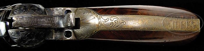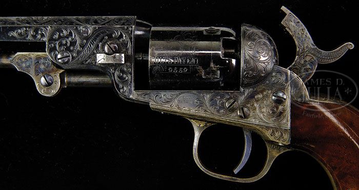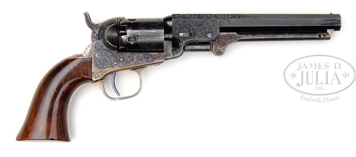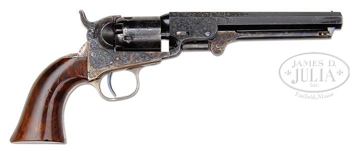 RARE ENGRAVED CASED COLT MODEL 1849 POCKET PERCUSSION REVOLVER. SN 309559. Cal. 31. Blue & color case hardened with 6″ oct bbl, brass pin front sight and 1-line New-York U.S. America address. Left side of frame has “COLTS PATENT” engraved in a pillow shape and left rear web of the trigger guard is stamped with the caliber. There is a small “E” stamped adjacent to the SNs on the frame, trigger guard & buttstrap signifying that the parts to this revolver were to receive extra polish for engraving. The silver plated brass trigger guard & backstrap contain a beautiful burl walnut 1-pc grip with last four digits of matching SN in backstrap channel. Frame is engraved in late vine style pattern, probably by Gustave Young with several scrolls terminating in flower blossoms. Matching engraving extends over both sides of bbl lug, the top side flats of bbl and on to the rammer pivot. Hammer is engraved in Mr. Young’s distinctive deluxe patterns of a wolf’s head on each side of the hammer nose, foliate arabesque patterns on the shank and fish scale patterns on the spur & top edge. Top of backstrap is engraved with his distinctive sunburst pattern and the backstrap, heel, buttstrap & trigger guard are engraved to match the frame with a sunburst pattern around the buttstrap screw. Cyl is 5-chambers with three serviceable safety pins and the stagecoach holdup scene roll marking. Accompanied by a wonderful brass bound rosewood casing with small brass panel in the lid, engraved with the initials “GLL”. Interior is purple velvet lined and French fitted in the bottom for the revolver, a replacement 3-compartment flask, a brass 2-cavity bullet & ball “COLTS PATENT” mold without sprue cutter, an L-shaped nipple wrench, a packet of combustible cartridges, a 250-count lacquered tin of Eley’s caps and a functioning key. This revolver was produced in 1868 during the height of the great Westward Expansion post-Civil War where arms of this era generally saw hard service on the western frontier with little or no maintenance. While engraved examples of this model Colt are not uncommon they are rarely found in such high condition and the French fitted case is extraordinarily rare. It is very likely that this revolver was a presentation to someone of high office or great importance. CONDITION: Extraordinarily fine, all matching including wedge, cyl & grip, appears to be new & unfired. Overall retains nearly all of its crisp, glossy orig blue and bright case colors showing only light edge wear and a few, very minor fine scratches on the bbl; cyl has a couple of thin spots, otherwise is equally new retaining virtually all of its orig factory blue in the chambers; trigger guard & backstrap retain thin silver plating with exposed brass a medium mustard patina. Grip is sound with a very few, very minor nicks in the finish and retains virtually all of its crisp, orig high-gloss varnish. Mechanics are crisp, brilliant shiny bore retaining about all of its orig blue. Case is extremely fine with light handling & storage nicks & scratches and retains about 90% orig varnish; interior is moderately faded with moderate soil in the revolver recess; flask is fine, mold appears to be new with the other accessories equally fine. This is truly a magnificent and one of a kind set. 4-46385 JR106 (40,000-60,000)