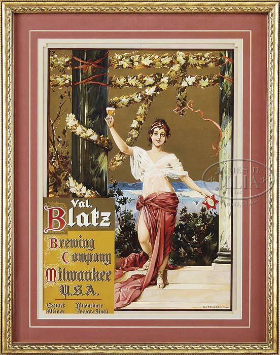 VAL. BLATZ BREWING COMPANY PRINTER’S PROOF. A Maxfield Parrish-esque portrayal of a young woman in sheer dress holding aloft a glass of this Milwaukee, Wisconsin brewer’s beer. Chas. W. Shonk Co. Litho., Chicago for the Val. Blatz Brewing Co. SIZE: Sight Size: 15″ w x 21-3/4″ h in frame. CONDITION: Near excellent. 1-10414 (600-1,000) Auction: Advertising, Toy & Doll - Fall 2011 Please Note: All prices include the hammer price plus the buyer’s premium, which is paid by the buyer as part of the purchase price. The prices noted here after the auction are considered unofficial and do not become official until after the 46th day. |