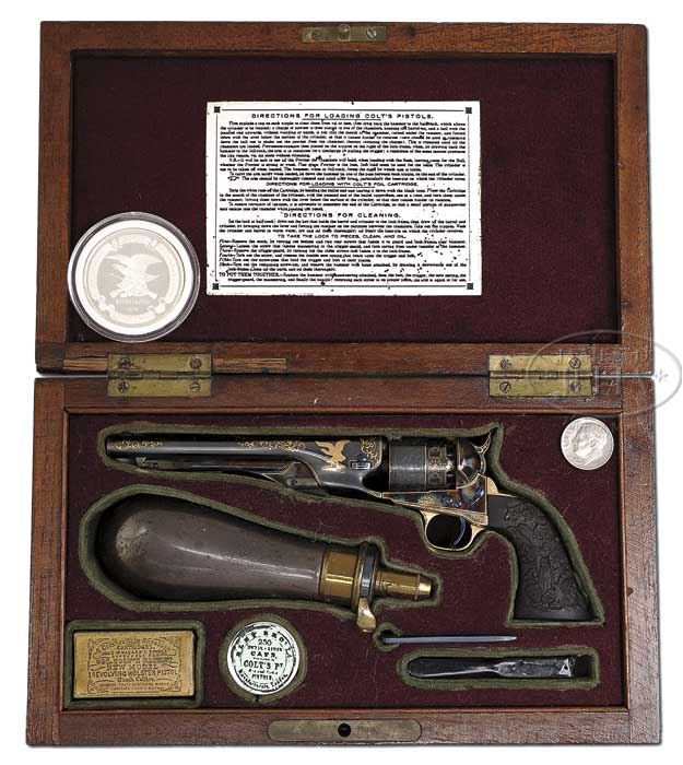 RARE FUNCTIONING MINIATURE GOLD INLAID COLT MODEL 1860 ARMY PERCUSSION REVOLVER. SN 162878E. Precise scale miniature of the cased pair of 1860 Army revolvers being sold elsewhere in this auction. It has 3-3/4″ rnd bbl, German silver front sight and 1-line address inlaid in gold “ADDRESS COL. COLT LONDON”. Frame is beautifully color case hardened, 3-screw style, cut for shoulder stock that has “COLTS PATENT” in inlaid in gold on left side. The brass trigger guard & steel backstrap are gold plated and contain a 1-pc ebony grip that is very delicately raise carved with an eagle & shield along with Lady Liberty and a tree on left side that is probably symbolic of the Venerable “Charter Oak”. It has a raised anchor surrounded by acanthus leaves and vines on right side. Bbl is inlaid in gold with a flying eagle on left side clutching arrows and a ribbon inscribed “E PLURIBUS UNUM”. Right side has seated Lady Liberty with a shield & staff topped by a Liberty cap. Both sides of bbl, top of bbl and around muzzle have foliate arabesque patterns inlaid in gold. Cyl is rebated with six chambers and has the Ormsby Naval Battle scene roll marking with foliate arabesque patterns and gold wire borders. Frame & recoil shields are outlined gold wire with the hammer having gold wire outline and an engraved wolf’s head on each side of hammer nose inlaid with a gold eye & tongue. Top edge of hammer is inlaid with a gold arrow. Accompanied by its orig rosewood casing with empty plaque in the lid and French fitted in bottom for the revolver, a miniature Dixon bag flask that is marked on the top, a miniature packet of combustible cartridges, a miniature tin of Eley’s caps, a miniature L-shaped nipple wrench and a miniature 2-cavity bullet mold without sprue cutter. Inside lid has a miniature reproduction of the Directions for Loading label. Accompanied by an NRA silver club medal, #63, for one of the ten best miniature weapons. CONDITION: Crisp & new, retaining virtually all of its brilliant orig finish. Case & contents are also new. 4-45696 JR189 (10,000-20,000)