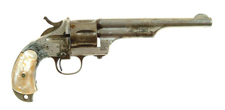 2ND MODEL MERWIN & HULBERT POCKET ARMY SINGLE ACTION REVOLVER. Cal. 44 WCF. SN 4788. Nickel finish with 7” bbl, open top with scooped flute cylinder, birdhead grip with integral lanyard hole and pearl grips. Has Hopkins & Allen markings on the bbl with the “CALIBER WINCHESTER 1873” frame markings. CONDITION: About good. Retains 70-75% original nickel overall with scattered patches of heavy pitting. Mechanics are slightly loose, bore is dark and worn, left grip has a repaired crack and there are chips on bottom edges. 4-51268 JR10 (1,500-2,500)