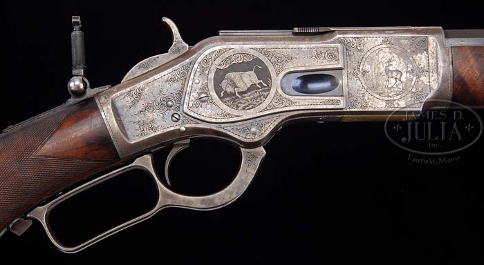 EXTRAORDINARILY RARE JOHN ULRICH ENGRAVED GOLD INLAID WINCHESTER 2nd MODEL 1873 DELUXE LEVER ACTION RIFLE, IDENTIFIED TO FAMED SPORTSMAN COL. ARCHIBALD ROGERS. SN 75788. Cal 44 WCF (44-40). Extraordinary deluxe John Ulrich engraved identified ’73 with 24 1/4″ oct bbl, button magazine, ivory bead front sight and modified early style, short semi-buckhorn rear sight that has been filed flat. Top tang is mounted with a Lyman loop thin-base tang sight with fine spiral-knurled bbl, with target and hunting apertures. Receiver is second type with screwed-on dust cover rail. It is mounted with about 3X, center crotch, flame-grain American walnut with H-style checkered forearm and pistol grip stock with fleur-de-lis inlay in the serpentine gripcap and it has a smooth steel shotgun buttplate. Bottom of stock is hand-carved with 38 notches and three dots in addition to seven additional crossing notches. It is unknown what the scorekeeping was for, but presumably, it was big game animals taken. Left side of lower tang is marked with the assembly no. “697” that is preceded by an “S” which signifies shotgun butt and also with “XXX”. The assembly no. was observed in the top tang channel of the buttstock with the buttplate having the number “39” inside the toe, although there is no doubt that this is the original Ulrich engraved buttplate. The receiver is spectacularly engraved by John Ulrich and signed on the bottom tang “J.Ulrich”. Left sideplate is engraved with the large vignette of a deep-relief running bull elk leaping over a fallen log in a detailed forest scene. Right sideplate is engraved with a deep-relief running bull buffalo in a very detailed prairie scene. Right front side of the receiver is engraved with a large vignette of a young bull elk feeding on a tree branch in a detailed forest scene. Left front side of receiver has a large vignette containing the inlaid flat gold intertwined initials “AR”. All the engraving on the receiver is surrounded by very fine foliate arabesque patterns with chipped borders. Top of the receiver, dust cover rail, dust cover, sides and rear edges of hammer, sides and face of lever, forend cap and around the buttplate screw holes are engraved to match. Bottom of receiver and carrier are engraved in mirror image foliate arabesque patterns with the carrier having a chipped border. Accompanied by a Cody Firearms Museum letter identifying this rifle with octagon bbl, plain trigger, checkered stock with pistol grip, half magazine, shotgun butt, case hardened and engraved “$27.50, etc.-see order”. It was received into and shipped from the warehouse on October 20, 1881 to order no. 28214. Obviously, the “see order” notation would have detailed the number and types of vignettes as well as the gold inlaid initials and possibly the deluxe wood. A companion rifle, a deluxe engraved 1876, also signed “J. Ulrich”, is being sold as the lot preceding this rifle. Personal historical information for this rifle is contained in the preceding lot, the Winchester Model 1876 that also belonged to Col. Archibald Rogers. PROVENANCE: Herbert G. Wellington Jr. Estate. CONDITION: Very fine. Bbl retains about 95% strong orig blue, slightly dulled, over the chamber area and with light sharp edge wear. Receiver retains 65-70% faded original case colors, a little stronger in the sheltered areas, with the balance turned silver. Dust cover retains about 90% orig blue. Lever and hammer retains smoky case colors, stronger on the hammer. Wood is sound with a couple of small grain checks in the buttstock and light handling and use marks and retains about 60% original finish on the forearm with the balance slightly dull. Buttstock retains most of its original piano varnish finish, slightly dulled. Both forearm and wrist checkering show moderate to heavy wear. Buttplate is a gray patina. Mechanics are crisp, bright shiny bore. 4-38550 JR287 (50,000-125,000)