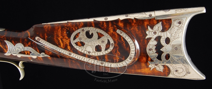 EXTREMELY FINE SILVER MOUNTED HALF-STOCK RIFLE WITH EXTRA BBL. SN NSN. This is a great example of a western PA or Ohio half-stock rifle. It has two interchangeable 33″ full oct unmarked rifled bbls, one 41 Cal and one 32 Cal. The engraved back action lock is marked “GEOe GOULCHER”. The rifle has 27 engraved silver inlays and a 5-1/2″ silver toe plate and nicely engraved silver capbox. The silver trigger guard is engraved as well. The entrance ferrule/nose cap is of pewter. This extremely rare and fine half-stock rifle is pictured in Kentucky Rifles and Pistols 1750-1850 by the KY Rifle Assoc. PROVENANCE: Ex Ronald Gabel Collection. CONDITION: Condition of the rifle is excellent and orig throughout. There is provision for a tang sight; however, the sight is not included. There is no evidence of any repairs or restoration. The 41 Cal bbl was orig fitted with a false muzzle; the false muzzle is not present and the holes in the end of the bbl have been plugged. 4-33784 RGG45 (15,000-25,000)