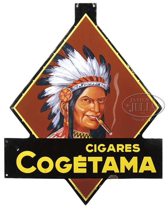 COGETAMA PORCELAIN CIGAR SIGN. Two-sided die-cut sign with colorful Indian chief smoking a cigar. Manufactured by Emaillerie Belge ,Bruxelles, circa 1936 for the European market. SIZE: 28-1/2″ w x 36-1/2″ h. CONDITION: Very good with a few chips but still retains nice original surface gloss. 1-11245 (750-1,500) Auction: Advertising, Toy & Doll - Fall 2011 Please Note: All prices include the hammer price plus the buyer’s premium, which is paid by the buyer as part of the purchase price. The prices noted here after the auction are considered unofficial and do not become official until after the 46th day. |