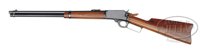 *EXCEPTIONAL MARLIN MODEL 94 SADDLE RING CARBINE. SN 444621. Cal .44-40. Carbine style 20″ bbl with integral carbine front sight and carbine leaf rear sight. Bbl markings are “Marlin Firearms Co., NEW-HAVEN, CT. U.S.A./PAT’D OCT. 11, 1887. APRIL 2, 1889. AUG. 1, 1893.” Full mag. Standard blued carbine receiver with saddle ring. Top tang marked “Marlin/MODEL’94”. Standard carbine style stock and forend with steel carbine buttplate. PROVENANCE: Richard Rohal Estate Collection. CONDITION: Very fine. 98% bbl and mag tube blue with very light handling marks. Receiver has 95% blue with light edge wear, some light scratches and patina on the top tang. Lever has vivid case colors in the protected areas becoming lighter on the bottom. Buttplate has very good blue with scattered surface oxidization and pitting. Sound stock and forend with good finish showing normal wear and handling marks. Crisp mechanics and an excellent bore. 4-40420 DS33 (3,500-5,000)