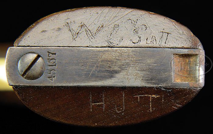 RARE CONFEDERATE IDENTIFIED COLT 1860 ARMY REVOLVER AND ORIGINAL HOLSTER. SN 45167. Cal. 44. This is a very nice “as found” example of 1862 manufactured martial Colt Army that was apparently captured by Captain William C. Scott of the 13th Virginia Infantry. This gun is in beautiful orig complete condition with all parts orig and all matching SN. Captain Scott’s name is nicely scratched into the bottom of the left stock “W. L. Scott”. Another set of initials “H J T” are also found on the butt and on the belt loop of the accompanying martial holster. Captain Scott apparently obtained this gun from the unknown soldier “H J T”. This pistol originated in a family grouping that once also had a unique Gordonsville Virginia made sword by “Fishback and Moyer.” This grouping was once displayed at the National Civil War Museum, Harrisburg, PA. Still retained with this pistol and holster is a circa 1900 photograph of Captain Scott in his UCV uniform, wearing his “Southern Cross of Honor”. The reverse of this photograph details Captain Scott’s wartime history beginning in 1861 as Captain of the Gordonsville Grays Company C 13th Virginia Infantry. He was later with Crenshaw’s Battery, fought in the battles of Bull Run, Gaines Mill, Ceder Mountain, Antietam, and lastly Fredericksburg, Virginia, when in December 1862 he was appointed Major and Chief Quartermaster of the 3rd Corps Army of Northern Virginia. In this capacity he was present at the battles of the Rappahannock, Chancellorsville, Gettysburg, the Wilderness, Spottsylvania, Petersburg, and Appomattox. Major Scott is buried in Maplewood Cemetery in Gordonsville, Virginia where he was born and served his country. Confederate used Colts are quite rare with such good provenance. PROVENANCE: Capt. W.L. Scott, Descendants of Scott, Jackie Eubanks, National Civil War Museum, private southern collection. CONDITION: Very good to fine overall, metal is gray with strong traces of blue on bbl and bbl housing and case colors on frame and hammer. There is scattered staining, pitting and muzzle wear. Cyl retains 90% of the naval battle scene. Mechanics are fine. Stocks retain good discernible cartouches with scattered dings and dents. Markings are all fine and sharp, including SN, bbl address, inspector’s mark, and soldier’s scratched name, as can be seen in photographs. Holster is very good overall, still being soft and pliable, some orig finish is still present though there are large areas of scuffing and flaking. Backstrap is marked by military contractor “Gaylord” and the orig owner’s initials are discernible above that mark. Holster plug is missing and tab is detached but still complete. Accompanying photograph, which is mounted on orig 6″ x 5″ card, is in very good condition as is the contemporary ink inscription on reverse. 4-46211 JS1 (5,000-7,000)