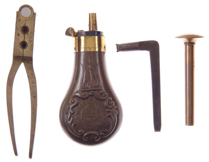 CASED INSCRIBED WESSON & LEAVITT MASS ARMS PERCUSSION BELT REVOLVER. Cal. 31. NSN. Only about 1,000 of these revolvers were made in period 1850-51. Beautiful little revolver with 4” rnd bbl, open bottom receiver, 6-shot cyl with etched decoration and very nicely engraved frame, lockplate & hammer. Triggerguard is engraved to match with “Bartlett” in a ribbon. It has smooth 1-pc walnut grip with flared butt and brass backstrap. Accompanied by its orig burgundy velvet lined, striped tiger maple case compartmented in bottom for revolver, a spectacular Mass Arms eagle flask, brass 2-cavity bullet mold without sprue cutter, “MASS ARMS CO” marked on bottom. It also has its brass bullet starter/rammer and an L-shaped nipple wrench. Another compartment has the orig key. It appears that there was a Ralph W. Bartlett who served the Confederacy during the Civil War in Company K, Texas 9th Infantry and also the 6th Tennessee Infantry from 1862-1863. Also accompanied by a machinist’s or engineer’s straight edge, beautifully etched “Ralph W. Bartlett”, with its leather case. CONDITION: Appears to be new & unfired with bbl retaining 98-99% glossy orig blue and frame, lockplate, hammer & triggerguard virtually all of their bright orig case colors. Cyl is faded, silvered case colors. Grip is sound and retains virtually all of its orig varnish. Timing needs adjustment, otherwise mechanics are fine, bright shiny bore. Case is sound with a couple of dings in bottom and top and retains most of its orig varnish with nicks & light scratches. Interior is slightly faded with soil in bottom from the revolver. Flask is virtually new. Mold has one bent arm, otherwise appears unused. Straight edge is extremely fine, leather case shows a little wear. A beautiful set in seldom encountered condition. 4-31059 JR497 (7,500-12,500)