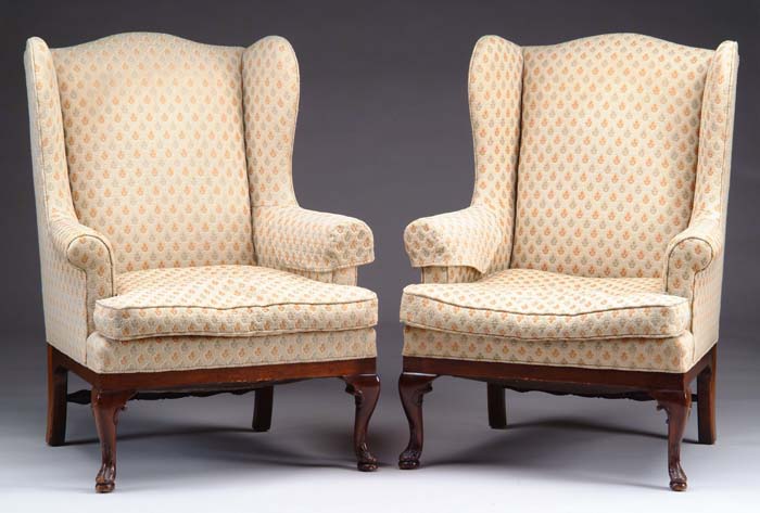 PAIR OF UPHOLSTERED WING CHAIRS. Mid 20th Century. Matched pair have Queen Anne carved legs and feet, nicely turned stretcher and removable cushions. Upholstered in a beige fabric with green and rust decoration. PROVENANCE: From a Camden, Maine Estate. SIZE: 40-1/2” h x 30-1/2” across arms. CONDITION: Some fading to upholstery, very good. 9-72275 (400-600)