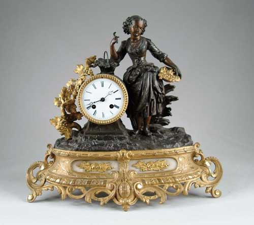 FINE FIGURAL MANTLE CLOCK. The cast metal figure of Josephine with two baskets of grapes stands beside a round clock with white enameled dial having two keyholes. Grape branch mounts on side. The foliate scrolled brass/ormolu base front has white onyx panels mounted with rose decoration. The movement marked “C. Ketterer Paris No. 6997”. Key and pendulum are present. SIZE: 15-1/2” h x 17” w. CONDITION: Unknown working order. Dial has imperfection or repair at 12:00 o’clock. Otherwise very good. 9-99380 (600-1,000)