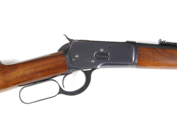 *RARE WINCHESTER MODEL 92 TRAPPER LEVER ACTION SADDLE RING CARBINE. SN 970774. Cal. 38 WCF (38-40). Standard grade carbine with 16″ bbl, full magazine, square base front sight and carbine ladder rear sight. It has a staple & ring in left side of receiver. Mounted with very nicely figured, uncheckered, straight grain American walnut with 7-7/8″ carbine forearm with bbl band and straight stock with steel carbine buttplate. Trapper carbines are rarely encountered today with any orig finish. The vast majority of these little carbines were sold to South & Central American customers where they saw continuous service in harsh jungle environments with little or no maintenance. PROVENANCE: David Bichrest 1992; Robert Howard Estate Collection. CONDITION: Extremely fine plus, possibly unfired. Bbl & magazine tube retain 98-99% crisp orig factory blue; receiver retains 95-96% crisp orig blue with a faint halo from the saddle ring and some minor flaking on the belly; lever & hammer retain about all of their orig blue; wood is sound with a very few, very scattered minor nicks & scratches and retains most of its orig factory oil finish; buttplate retains 60-70% orig blue with wear at the heel & toe and losses from flaking. Mechanics are crisp, brilliant shiny bore. 4-45429 JR176 (12,500-17,500)