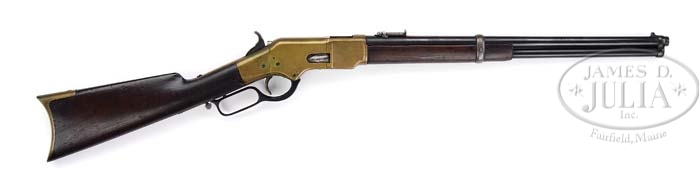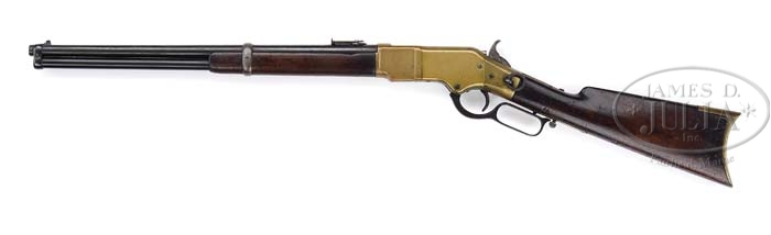 WINCHESTER 1866 SADDLE RING CARBINE. SN 151800. Cal. 44 CF. 19-3/4″ rnd bbl, mag tube is 1/4″ shorter, modified barley corn front sight, ladder carbine rear sight in reverse position, standard bbl markings, standard receiver with staple and ring on left side. Mounted with straight grain walnut, straight grip, crescent brass buttplate with trapdoor, standard carbine forend with band. Accompanied with Cody Firearms Museum Winchester letter, identifying as carbine, received in warehouse December 11, 1878, to Musket on October 15, 1879, ship from warehouse on October 15, 1879 Order No. 17577. PROVENANCE: Herbert G. Wellington Jr. Estate. CONDITION: Good. Bbl and mag tube retain a dark restored blue finish with normal nicks, dings & scratches, receiver is a dark mustard patina with slightly rounded edges and normal nicks & dings and green verdigris showing on seems. Stock is sound, slightly shy on tangs and receiver, numerous nicks, dings & dents, undersized at tang of buttplate and retains a dark open gran oil finish. Forend is sound with hairline crack forward of band, a couple shallow gouges, and retains a dark open grain oil finish. Mechanics are good, distinct rifling in dark bore with scattered pits. 4-38535 BDT267 (2,000-3,000)