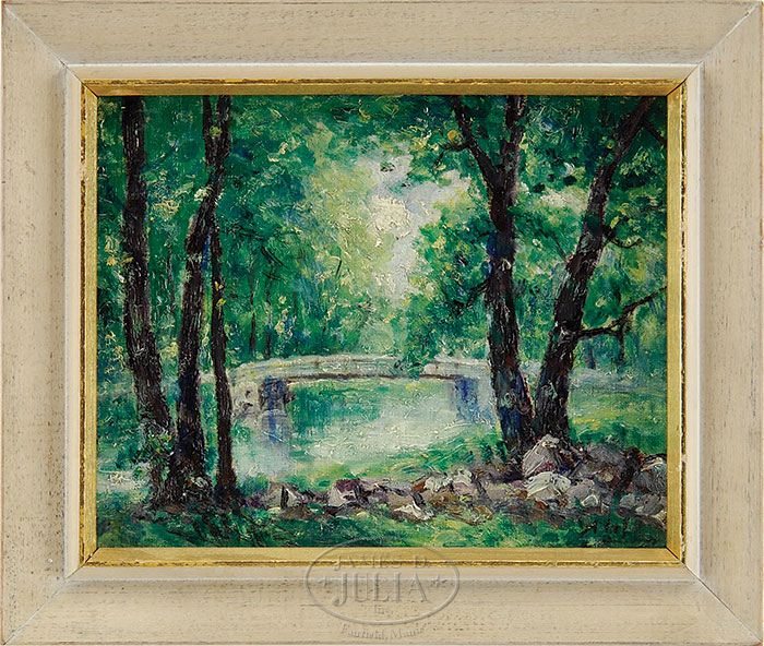 HENRY HAMMOND AHL (American 1869-1953) FIVE WORKS. All housed in identical frames but different sizes, each with a painted wood frame with gold edge. 1) Signed Winter scene showing farm at dusk. 2) Signed showing a Spring scene with bridge over river, titled “The Concord Bridge” in pencil signed on reverse. 3) Signed coastal seascape with sailboat, rocks and ocean. 4) Unsigned seascape with waves, coastal rocks and sailboat. 5) Signed Spring scene with road through woods. SIZE: 2 – 5-3/4″ x 7-3/4″ and 3 – 7-1/2″ x 9-1/2″. CONDITION: Very good. 9-26344 (1,000-2,000)