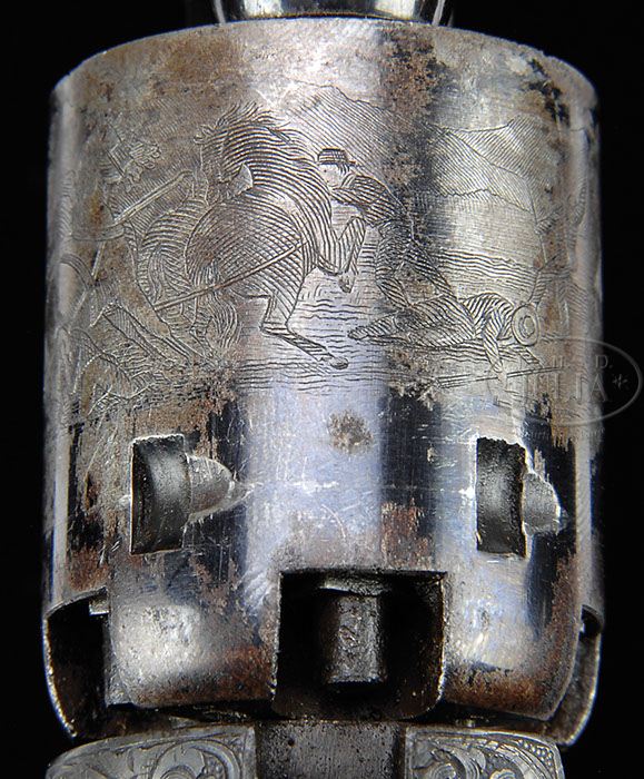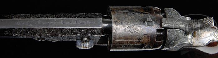 BEAUTIFUL GUSTAVE YOUNG ENGRAVED COLT MODEL 1849 POCKET PERCUSSION REVOLVER. SN 109049. Cal. 31. Blue and color case hardened with 5″ oct bbl, brass pin front sight and “Saml Colt” engraved address. Left side frame is engraved “COLTS PATENT” in a pillow shape. Small guard silver plated brass trigger guard and backstrap contain a beautiful, varnished, burl walnut 1-pc grip with last 4 digits of matching SN in backstrap channel. SN is found on frame, bbl lug, trigger guard, buttstrap and cyl with last 5 digits of matching SN on wedge and last 4 digits of matching number on rammer handle and grip. Frame is beautifully engraved by Gustave Young with full coverage foliate arabesque patterns and very fine punch dot background. One scroll on left recoil shield and another on right side of frame terminate in flower blossom. Hammer has also received his deluxe treatment with foliate arabesque patterns on shank, wolf’s head on each side of hammer nose, fish scale patterns on the sides of the spur & top edge. Tip of spur is hand checkered. Deluxe coverage extends onto bbl lug with 1 scroll on left side terminating in Mr. Young’s dog’s head and another on the right side terminating in a flower blossom. Rammer pivot is engraved to match. The area behind the hammer slot has Mr. Young’s sparse sunburst pattern with foliate arabesque patterns on backstrap, buttstrap and trigger guard. Screw heads and tips are also engraved, indicating that this is one of Mr. Young’s more elaborate presentations quality pieces. Cyl is 5-shots with stagecoach hold-up scene roll markings, 4 of 5 safety pins are serviceable. CONDITION: Extremely fine, all matching including wedge, cyl and grip. Bbl retains 97-98% glossy orig blue with very light muzzle and minute sharp edge wear. Rammer and pivot retain strong, bright orig case colors with handle faded to gray. Frame and hammer retain about all of their strong, orig case colors, a little dark on hammer. Cyl retains 30-40% orig blue with the balance flaked to a light patina and overall shows about 98% stagecoach hold-up scene that was probably enhanced by Mr. Young. Grip frame retains virtually all of its strong orig silver. Grip is crisp, showing very minor handling and use with faint sharp edge wear and retains about 98-99% strong orig varnish. Mechanics are crisp, bright shiny bore with a few scattered spots of pitting. 4-47042 JR389 (25,000-40,000)