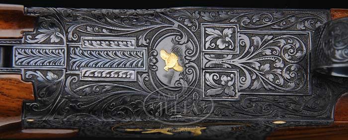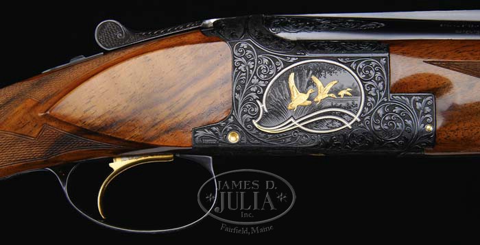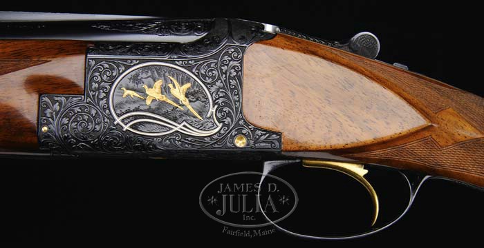Additional Information: We have discovered a very slight (hard to see) hairline at the tip of the forend. This is very minor irregularity can be easily restored. *FANCY BROWNING MIDAS GRADE RKLT SUPERPOSED SHOTGUN. SN 38499V5. Cal. 20 ga. 26-1/2″ bbls with hand-filed, vent rib with dual ivory sighting beads, 3″ chambers, choked IMP-CYL / MOD with gold sgl selective trigger & ejectors. Chamber area of top bbl on left side marked “BROWNING ARMS COMPANY ST LOUIS MO. & MONTREAL P.Q. / MADE IN BELGIUM” and right side “SPECIAL STEEL – 20 GA – SHELLS 2-3/4″ & 3″ / PATENTS NO 2203.378-2233.861”. There is a 2″ wedge of floral engraving on each side of rib. Usual “Midas” engraving with flowing floral scroll with punch-dot background & vignette of 3 gold pheasants in flight encircled by gold wire on left side, 3 gold ducks in flight encircled with gold wire on right side, gold quail in flight on bottom of receiver, gold hammer & ejector pins; signed on both sides by master engraver J. Baerten. Mounted with fine colorful piece of French walnut, checkered round pistol grip with long tang & Browning hard rubber butt plate. Full checkered field style forend. Bore diameter: top -.621, bottom -.621. Bore restrictions: top -.011, bottom -.006. Wall thickness: top -.035, bottom -.040. Drop at heel: 2″, drop at comb: 1-3/8″. Weight: 6 lbs. 2 oz. LOP 14-1/4″. Accompanied by Browning luggage case. CONDITION: Extremely fine. Bbls retain 98-99% orig blue with faint rub mark on bottom bbl from forend & a few light handling marks. Receiver has 99% orig blue with just a faint touch of wear on bottom bbl lugs. Stock is sound & retains virtually all of its orig finish with just a few light handling marks. Same holds true for forend. Mechanics are crisp with strong ejectors & bright shiny bores. Case is in very nice shape, both inside & out. 4-35135 BDT96 (10,000-15,000)