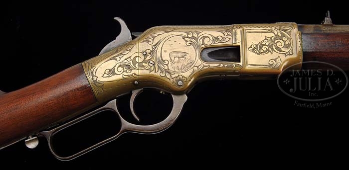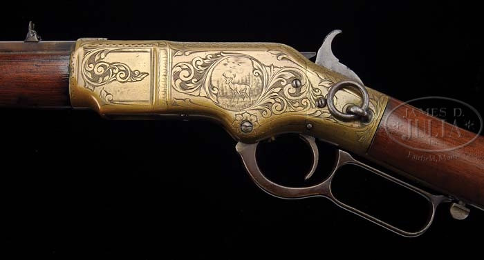 CUSTOM ENGRAVED WINCHESTER 1866 SADDLE RING CARBINE. SN 101667. Cal. 44 CF. 20″ rnd bbl, full mag, bbl band front sight, two leaf flip rear sight. Standard bbl markings, standard receiver is custom engraved with flowing foliate scroll with punch dot background, circle with buck dear on left side and circle with bear on right side. Edges of receiver have chip and dot border, with diamond and dot pattern across top. Left side with staple and saddle ring. Mounted with replacement straight grain walnut, straight grip, brass carbine buttplate with trap door, standard forend with band. PROVENANCE: Herbert G. Wellington Jr. Estate. CONDITION: Good. Bbl and mag tube retain traces of blue in protected areas, but show mostly a brown/silver patina. Receiver has good custom engraving with some slightly rounded edges and retains a pleasing mustard patina. Replacement stock is sound with minor chip missing at toe and blended and finished and retains a varnish finish that has dried and cracked and blending with hand worn patina. Forend is sound with shallow gouge front side forward of bbl band, a grain crack running from receiver to band on left side and retains a thin coat of added finish. Mechanics need work, extractor is a homemade replacement, has a weak lever retaining spring and lifter will only come up by pushing from bottom, bore is dark with strong rifling and moderate scattered pitting. Lever latch appears to be a replacement as it does not quite catch lever. 4-38536 BDT260 (3,000-5,000)