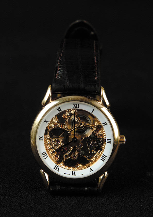INTERESTING SKELETON WRISTWATCH BY HAMILTON WATCH CO. Serial No. 9928 with a Swiss movement, which has see through case. Yellow gold-like case. CONDITION: Very good. 9-94700 (100-200)