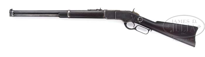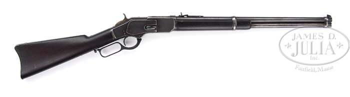 Additional Information: Accompanied by Factory Letter , not in description, confirming configuration. FIRST MODEL WINCHESTER 1873 SADDLE RING CARBINE. SN 15792. Cal. 44-40. 20″ rnd bbl, full mag, dovetailed miniature Rocky Mountain front sight, replacement serrated side, “V” notch sporting rear sight, dovetail for orig carbine ladder sight is present. First model 73 receiver with mortised dust cover, cover missing. Left side with staple and saddle ring. Mounted with straight grain walnut, steel carbine buttplate with trap door, standard forend with band. PROVENANCE: Herbert G. Wellington Jr. Estate. CONDITION: Very good. Bbl retains a blue blending with brown patina finish, normal nicks & scratches and some areas with shallow surface oxidation. Replacement front bbl band. Receiver retains a restored blue finish, with wear at sharp edges, faint mark from saddle ring and blending with a brown patina. Stock is sound with hairline crack behind top tang, some minor chips on both side of lower tang, typical nicks, dings & handling marks and retains a dark open grain oil finish. Forend is sound with normal nicks, dings & dents, and retains a dark open grain oil finish. Mechanics are crisp with a very nice shiny bore. 4-38526 BDT257 (2,000-3,000)