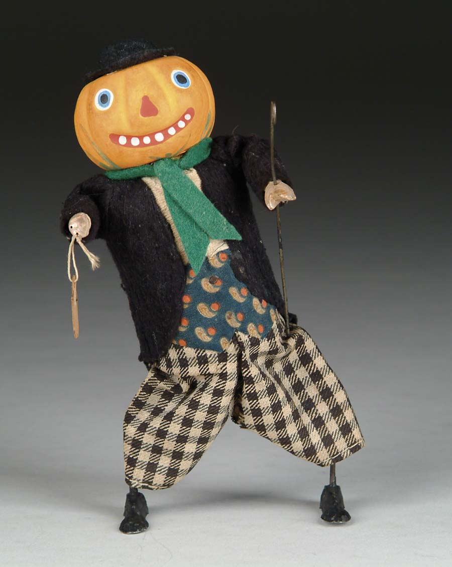 MECHANICAL PUMPKIN FIGURE. Cloth dressed tin body with wind-up movement. Composition pumpkin-head figure sways side to side. SIZE: 7” t. CONDITION: Replaced or repainted head not original to toy; clothes are good and toy is working. WP 1-3717 (1,200-1,500) Auction: Advertising, Toy & Doll - Spring 2005 Please Note: All prices include the hammer price plus the buyer’s premium, which is paid by the buyer as part of the purchase price. The prices noted here after the auction are considered unofficial and do not become official until after the 46th day. |