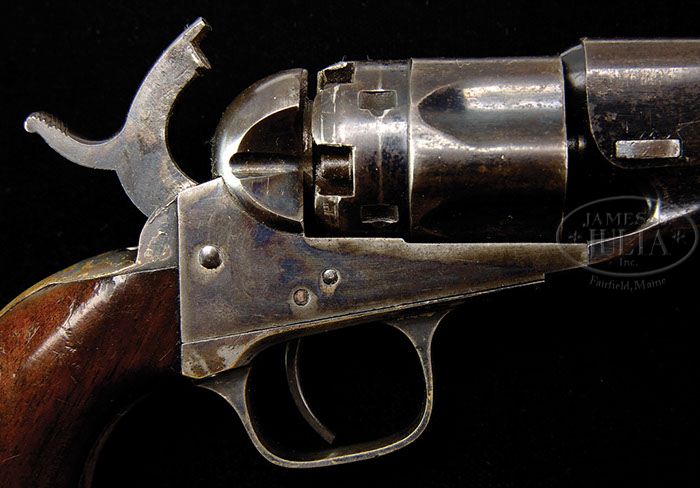 Correction: The catalog estimates should read (40,000-60,000). VERY RARE CASED COL. COLT PRESENTATION COLT MODEL 1862 POLICE PERCUSSION REVOLVER TO “WILLIAM G. MOORE WITH COMPLIMENTS OF COL. COLT”. SN 7289. Cal. 36. Blue & color case hardened with 4-1/2″ rnd bbl, brass pin front sight and 1-line New-York U.S. America address. Left side of frame is marked with a tiny “COLTS PATENT” and left shoulder of trigger guard has the caliber marking. It has usual 5-shot half fluted cyl and the silver plated brass trigger guard & backstrap contain a 1-pc walnut grip, matching numbered in the backstrap channel. Backstrap is engraved in period script “William G. Moore / with compliments of Col. Colt”. Accompanied by an orig, burgundy velvet lined Colt casing, compartmented in bottom for the revolver, a sgl-sided “COLTS PATENT” eagle & stars flask and a blued steel 2-cavity bullet & ball “COLTS PATENT” mold with sprue cutter marked on right side “36 P”. Also accompanied by a lacquered tin of Eley’s caps and several cast lead bullets & balls. William G. Moore was a native of the District of Columbia, residing in Washington, D.C. who, in his early career, was a newspaper man covering congressional debates. He went on to serve in the Dept. of Public Works until the outbreak of the Civil War at which time he joined the National Rifles. He enlisted April 15, 1861 as a Private and was mustered out on July 15, 1861 when he was requested to serve as the private secretary to the Secretary of War, receiving a promotion to the rank of Major and Adjutant-General of Volunteers. After the war he was appointed to the position of private secretary to Pres. Johnson. He was commissioned a Colonel and Paymaster of the Army. In 1870 he returned to Washington and was made Commander of the Washington Light Infantry and became a Colonel of the 1st Regiment of the District Militia. He was then appointed Superintendent of Police for the District of Columbia and became the longest serving Superintendent in the department’s history. He was responsible for numerous innovations in the department’s enforcement of laws, some of which are still in effect today. He died in office on July 12, 1898. CONDITION: Very fine, all matching including wedge & grip, only the number “89” is visible on the back of the cylinder. Bbl retains about 50% strong orig blue with the balance flaked, not worn, to a dark patina; frame retains bright to brilliant case colors on the sides, turned dark on recoil shields; hammer retains bright case colors on sides, dark on top & back edges; cyl retains about 50% thin orig blue with the balance flaked to dark patina; trigger guard & backstrap retain about 75% orig silver with exposed brass a dark reddish brass patina. Grip is sound showing light to moderate edge wear with light nicks & scratches and retains most of its orig varnish. Mechanics are fine, strong bore with good shine, frosty in the grooves. Case is sound with storage & handling nicks, dings & scratches and retains most of its orig varnish; interior is faded to a rose color with moderate soil and light damage inside the lid and moderate to heavy soil and heavy fading in bottom; flask retains 70-75% orig finish on the body with the collar & spout a medium mustard patina; mold retains 75-80% orig blue with clean cavities; cap tin is fine. 4-46707 (40,000-60,000)