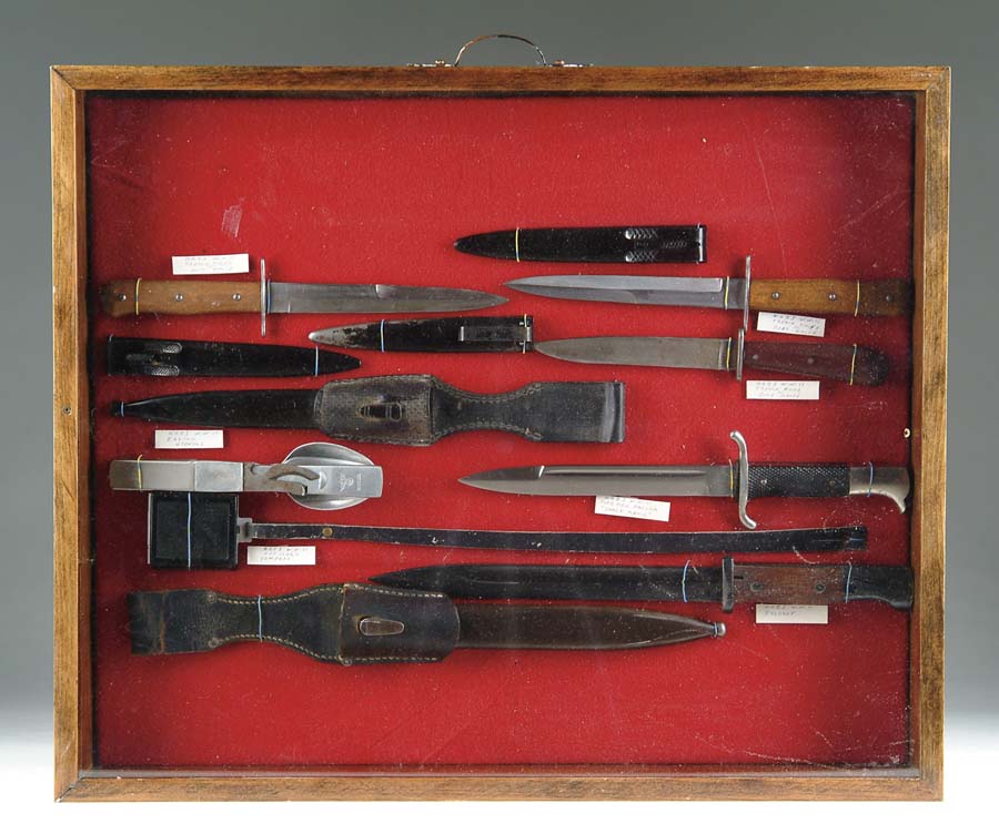 20” x 24” WOOD CASE W/PLEXIGLAS COVER CONTAINING A NUMBER OF NAZI ITEMS. Including a field mess set with knife, fork, and spoon and can opener by “W. A. L. 43.” A black plastic compass with one side graduated in centimeters, complete w/leather carrying strap. A K 98 bayonet marked “S/185 G” on the left ricasso complete w/scabbard. The hilt has two Waffenampt marks on the left side. The scabbard is metal and has a leather frog, retains most of the blue. Dack fireman’s short model dagger, complete with black painted scabbard and treated cloth frog, blade has been cleaned and sharpened, the hilt is fine & scabbard has minor chips missing, frog is well worn. Three trench knives, all with metal scabbards. One has a Bakelite hilt, other two have wood, blades have been cleaned, one scabbard is missing about 1/3 of black paint & others are fine. From the Collection of the late Barney Frost. 4-53555-25 FS203 (300-600)