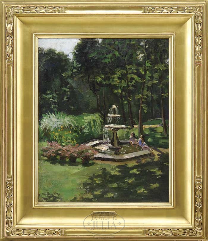 CARL HIRSCHBERG (AMERICAN, 1854-1923) THE PARK FOUNTAIN. Oil on canvas spring/summer scene shows a three-tier large fountain in a park and garden setting. Two girls are seated at edge of the fountain pool. Signed lower right “Carl Hirschberg”. Housed in an outstanding carved and gilt modern replacement frame with gilt wood artist plaque. SIZE: 20″ x 16″. CONDITION: Relined, minor inpainting. Very good. 9-20160 (1,650-1,850)