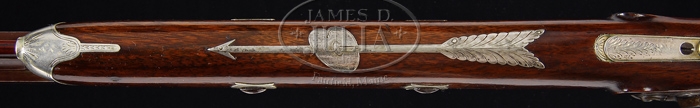 RARE A.Z. BROWN PHILADELPHIA SILVER MOUNTED HALF-STOCK. SN NSN. Elaborate half-stock rifle has 34-1/8″ full oct 41 Cal rifled bbl signed in script “AZB Philada”. Completely silver mounted, featuring 11″ silver engraved toe plate with three oval piercings and 6-1/2″ silver comb inlay. Nine silver inlays include 6″ depiction of arrow through heart under forend. Large engraved silver capbox on right-hand side with smaller oval engraved capbox on cheek piece side. Elaborately engraved 4-1/2″ rear sight, dbl set triggers. Anthony Z. Brown, listed at 515 No. 3rd St., Philadelphia, from 1837-1853, died in 1871. This rifle is the only known remaining signed example of his fine work. PROVENANCE: R. Gabel Collection. CONDITION: Very nice orig condition throughout, with no restoration or repairs, bbl shows inside pitting. 4-31705 RGG6 (8,000-12,000)