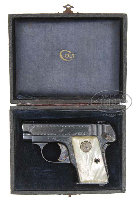*SCARCE FACTORY ENGRAVED COLT MODEL 1908 IN SPECIAL PRESENTATION BOX. SN 373893. Cal. 25 ACP. Blue finish with 2-1/8″ bbl, color case hardened trigger, thumb safety & grip safety and mounted with 2-pc smooth pearl grips with silver rampant Colt medallions. Accompanied by one orig 2-tone magazine. Pistol is lightly engraved in foliate arabesque patterns with running leaf & vine borders down each side of slide. Rear of slide & frame, along with the grip safety, front strap & trigger guard, are matching engraved. Also accompanied by an orig, black leatherette covered, blue velvet lined hard presentation box. Interior of lid is lined in blue satin with the stylized “COLT” logo embossed in gold. Bottom is recessed for the pistol. Accompanied by a copy of a Colt Factory Letter identifying this pistol in cal 25 with 2″ bbl, blue finish, pearl stocks, factory grade 3 engraving, shipped to “Lone Account”, Wolf & Klar, Ft. Worth, Tx on June 5, 1928, in a 1-gun shipment. Remarks section state that this pistol was returned to the factory August 1, 1929 and reshipped on Lone Account to Abercrombie & Fitch, NY, on January 22, 1930 and was sold to Abercrombie & Fitch on July 19, 1930. PROVENANCE: Tommy Rholes (1993); Robert Howard Estate Collection. CONDITION: Extremely fine plus. Appears to be new & unfired retaining virtually all of its orig Colt factory finish with bright blue and brilliant case colors that have thinned on grip safety; grips are extremely fine with great fire & color. Mechanics are crisp, brilliant shiny bore. Case shows moderate to heavy wear with a repaired hinge; interior is moderately faded & soiled. 4-45365 JR89 (3,000-6,000)