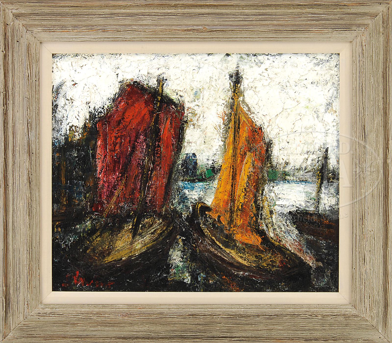 SIGNED (French School, Mid 20th Century) BOATS AT DOCK. Oil on canvas Housed in a naturalistic wood frame with linen liner Signed indistinctly bottom left SIZE: 18″ x 21-1/2″. Overall: 25-1/2″ x 29″. CONDITION: Two small patches to reverse, touch-up, very good. 9-26590 (300-500)