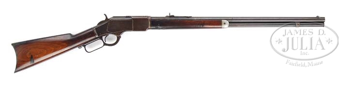 WINCHESTER 1873 LEVER ACTION RIFLE. SN 278015. Cal 22 Short. 24″ rnd bbl, full outer mag tube with inner 22 cal tube, base and part of a combination front sight, serrated side V-notch sporting rear sight with set screw, standard bbl markings, standard receiver with nicely figured straight grain walnut, straight grip, crescent steel buttplate, standard forend with nose cap. Accompanied with Cody Firearm Museum Winchester letter identifying as a 22 cal rnd bbl rifle, plain trigger, received in warehouse on September 20, 1888, shipped from warehouse on October 17, 1888 on order 13950. PROVENANCE: Herbert G. Wellington Jr. Estate. CONDITION: Fine. Bbl retains orig blue in protected areas with balance turning a brown-blue patina. Minor muzzle wear, typical nicks and dings. Below rear sight on both sides there are some small peen marks. Mag tube retains orig blue spotting and blending with brown patina. Receiver retains good orig blue that is blending with brown patina showing good orig polish marks and silvering at sharp edges. Stock is sound with some small slivers missing on both sides of top tang, normal nicks and dings, hairline crack behind bottom tang. There is a dark shallow depression on lower right side. Retains some orig finish blending with hand worn patina. Forend is sound with some shallow gouging in lower rear portion. Normal nicks and dings and has orig finish blending with dark hand worn patina across bottom. Mechanics are good. Dark bore with scattered moderate pitting. 4-38532 BDT271 (2,000-3,000)