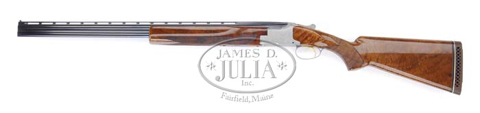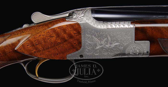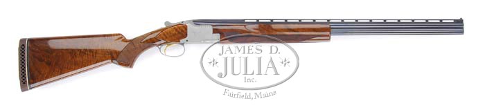*OUTSTANDING BROWNING PIGEON GRADE NEW-STYLE SKEET OVER/UNDER SHOTGUN. SN 3287J70. Cal. 410. 26-1/2″ bbls with matted, vent rib with dual white sighting beads, 2-1/2″ chambers, SKEET / SKEET chokes, gold selective sgl trigger & ejectors. Right side of bbl is marked “410 – GAUGE – SHELLS 2-1/2″ – MADE IN BELGIUM” and left side “BROWNING ARMS COMPANY”. French grade receiver is engraved with fine foliate arabesque scroll, with 2 pigeons in flight on each side of receiver, 2 bouquets of flowers across bottom combined with foliate arabesque scroll & carved oak leaves on top of receiver. Mounted with highly figured walnut usually reserved for higher grade, checkered pistol grip, Browning vented recoil pad & checkered new-style skeet beavertail forend. Bore measurements are not available for this gun. 1-3/4″ drop at heel; 1-3/8″ drop at comb. LOP 14-1/2″. Weight: 7 lbs. 3 oz. Accompanied by period Browning luggage case. Consignor states that this gun has been tested with silver nitrate & does not have salt wood. CONDITION: Extremely fine, near new. Bbls retain 98-99% orig blue with slight rub mark in front of forend & faint sharp edge wear on rib. Receiver has virtually all of its finish and is crisp & clean. Stock & forend are sound with a few minor handling marks, retaining virtually all of their fine factory finish. Mechanics are crisp with non-automatic safety, strong ejectors & bright shiny bores. Case is in near-new condition. 4-35868 BDT197 (7,500-10,500)