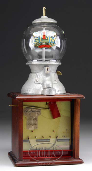 BLUEBIRD GUMBALL MACHINE AND TRADE STIMULATOR. One cent Bluebird gumball machine mounted atop a wood cased penny drop that would give your penny back if you deflected it through the opening below. SIZE: 9-1/4″ w x 21-1/2 t x 8-1/4 d. CONDITION: Good to very good; lower wood cabinet refinished and metal parts repainted. 1-7570 (1,000-1,200) Auction: Advertising, Toy & Doll - Spring 2007 Please Note: All prices include the hammer price plus the buyer’s premium, which is paid by the buyer as part of the purchase price. The prices noted here after the auction are considered unofficial and do not become official until after the 46th day. |