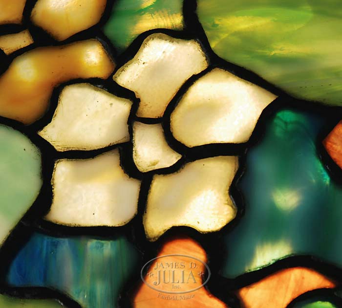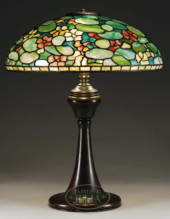 TIFFANY STUDIOS NASTURTIUM TABLE LAMP. Outstanding Nasturtium table lamp has lovely red, yellow and cream colored flowers set against a background of large green, white and yellow Nasturtium leaves. Background between the leaves is a brilliant blue with bright green striations. The border glass is a nicely rippled cream and tan. Shade is signed with 1″ tag “Tiffany Studios New York”. Shade rests atop a simple trumpet base with three socket cluster and a wonderful rich brown patina with green highlights. Base is signed on the underside “Tiffany Studios New York 573”. SIZE: Shade is 20-1/2″ dia. Overall 26″ h. CONDITION: Very good to excellent with very, very few tight hairlines. Base is very good to excellent with a very small dent to edge of foot. 5-67927 (85,000-100,000)
