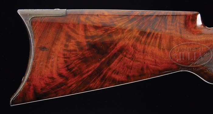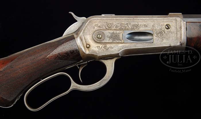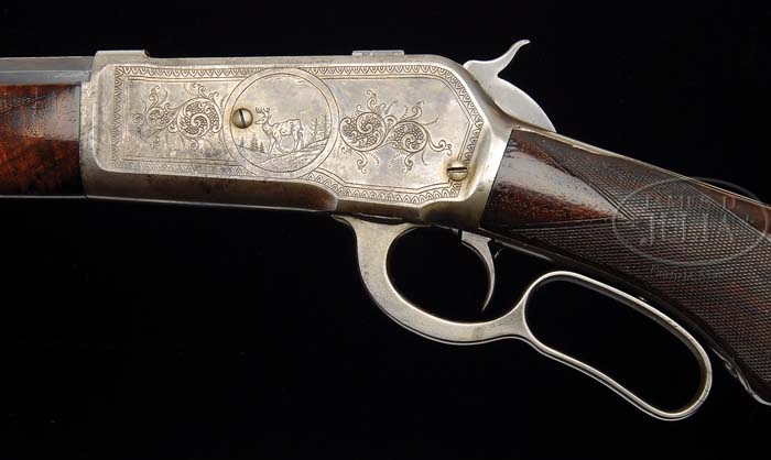 CUSTOM ENGRAVED WINCHESTER 1886 DELUXE LEVER ACTION RIFLE. SN 62831. Cal. 40-82. 26″ oct bbl, full magazine, fine bead front sight with bead missing, serrated side, sporting rear with set screw. Top of bbl marked “MANUFACTURED BY THE / WINCHESTER REPEATING ARMS CO. NEW HAVEN. CONN. U.S.A.” Adjacent receiver “40-82 W.C.F.” Receiver is engraved in factory pattern with circle and buck deer on left side with foliate arabesque scroll and punch dot background. Right side is foliate arabesque scroll with punch dot background. Both sides have scalloped border. Lower tang is equipped with single set trigger. Mounted with nicely figured “XX” walnut, checkered pistol grip with ebony insert in cap, crescent steel buttplate with scroll engraved tang, H-style checkered forend with scroll engraved with punch dot background pn nosecap. Accompanied by Cody Firearms Museum Winchester letter identifying rifle as 38-56, oct bbl rifle, set trigger, checkered stock with pistol grip, shot gun butt, received in warehouse October 27, 1891 and shipped from warehouse October 27, 1891 on order number 13218, returned and repaired November 11, 1893 on order number 3367. Inspection of lower tang reveals assembly number 34XX, the matching 34 can be found in top tang channel of stock. There is no number on inside toe of buttplate. Although it can’t be confirmed, it appears that on the R&R to factory the caliber was changed as well as buttplate treatment and probably engraved as the engraving appears to be that of Conrad Ulrich. PROVENANCE: Herbert G. Wellington Jr. Estate. CONDITION: Very good. Bbl retains 80-85% orig blue, thinning on sharp edges, usual minor nicks and dings and blending with some brown patina. Magazine tube shows orig blue in protected areas with balance thinning and blending with brown and silver patina. Receiver shows thinning orig case colors, blending with silver hardening and worn across bottom, blending with silver and brown patina. Engraving is quite sharp. Stock is sound with a couple minor chips around tang and receiver, slightly flat checkering, minor nicks and scratches and retains an added restored finish. Forend is sound with normal nicks and scratches, slightly flat checkering and retains an added restored finish. Mechanics are good with a weak main spring, a good bore with some scattered shallow pitting. 4-38563 BDT250 (5,000-8,000)