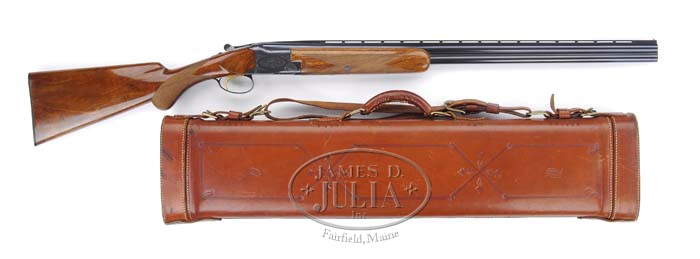 *EARLY 1960’S BROWNING SUPERPOSE GRADE 1 RKLT OVER/UNDER SHOTGUN. SN 22237. Cal. 20 ga. 28″ bbls with matted, vent rib with sgl silver sighting bead, 3″ chambers, choked MOD / FULL with gold sgl selective trigger & ejectors. Chamber area of top bbl on left side marked “BROWNING ARMS COMPANY ST LOUIS MO. & MONTREAL P.Q. / SPECIAL STEEL – 20 GA – SHELLS 2-3/4″ & 3”. Right side “PATENTS NO 2203.378-2233.86 / MADE IN BELGIUM”. Receiver engraved with standard fine scroll & floral and trademark circle “R” / “BROWNING” and bust of John Browning on bottom. Mounted with select grade straight grain walnut, checkered rnd knob pistol grip with long tang & Browning horn butt plate. Checkered field style forend. Bore diameter: top -.612, bottom -.612. Bore restrictions: top -.032, bottom -.012. Wall thickness: top -.038, bottom -.040. Drop at heel: 2″, drop at comb: 1-3/8″. Weight: 6 lbs. 7 oz. LOP 14-1/4″. Accompanied by “REDHEAD” brand 30″ hand-tooled leather case no. 17566 FD. CONDITION: Very fine. Bbl retains 98% orig blue with just a couple minor nicks & faint edge wear on rib. Receiver has 98% orig blue with some very minor sharp edge wear. Long tang trigger guard has 95% orig blue with minor sharp edge wear & starting to thin through grip. Stock is sound with a couple minor nicks & scratches & a little crazing of finish in heel & toe area. Checkering is clean & dry. Forend is sound with most of its orig finish with just some slight wear on right side bottom. Butt plate has a couple of spots of what appears to be brown paint. Mechanics are crisp with strong ejectors & shiny bores. Case is in excellent condition with all leather straps. 4-37241 BDT89 (2,500-3,500)