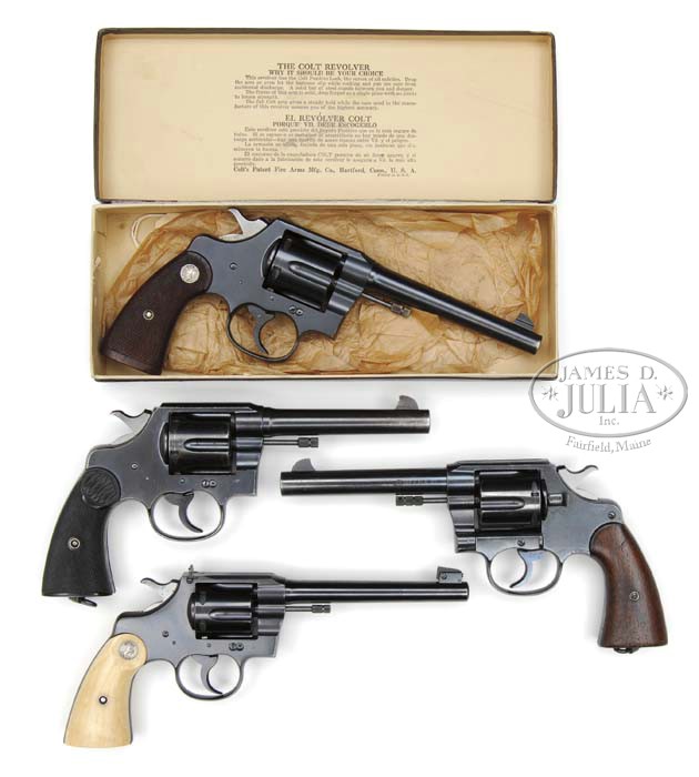*LOT OF 3 COLT NEW SERVICE REVOLVERS, AND ONE COLT OFFICERS MODEL TARGET REVOLVER. SN 44740, 18196, 305760, 337693. Colt no. 1. New Service. SN 337693 Cal. 38 Special. In original box. 6″ Bbl. Blue finish with square wooden grips, with Colt medallion. Purple box is marked 616 and with label for 38 wood and blue. Colt no. 2. New Service. RCMP. SN 305760 Cal.45. 5-1/2″ Bbl. Blued finish. Hard rubber grips. Back strap is stamped “R N W M P 2085”. Bottom of grip frame is stamped “MP” with lanyard swivel, and has white lanyard attached. Importers mark “Simpson Ltd (?) (?)” is in small electric pencil on bottom of grip frame. Mr. Howard’s notes indicate that he acquired this item from Paul Sorrell in 1998. Colt no. 3. U. S. Army Model 1909. SN 44740. Cal. 45 L C. Blued frame. Bottom of bbl is stamped “United States Property” with inspectors initials “RAC” which also appear on rear of cylinder, on bottom of each grip, and on right side of frame. Bottom of grip frame is marked “U. S. Army Model 1909 No 44740”. Mr. Howard’s notes indicate that he acquired this item from Bill Spicer in 1994. Colt no. 4. Officers Model Target, 3rd Issue with original ivory grips. SN 18196. Cal. 22 LR. 6″ Standard bbl and target sights. Nicely colored elephant ivory grips, have SN in pencil on insides of each grip. Mr. Howard’s notes indicate that he acquired this item from Bill Spicer in 1998. PROVENANCE: Robert Howard Estate Collection. CONDITION: Colt no. 1. Excellent. Retains nearly all its orig blue finish with a number of minor marks and scratches. Bolt drag line around cylinder. Grips excellent. Bore is excellent. Action crisp. Box has some edge wear, and chipping, but is generally fine. Colt no. 2. Excellent. Bbl frame and cylinder retain 80 – 90% orig blue, bbl silvering toward muzzle, frame on high edges and at rear, as well as, grip straps. Cylinder blue is getting a bit thin, bright in flutes. Bore is excellent. Action is crisp. Colt no. 3. Excellent, probably as arsenal or factory refinished. Retains 90 – 95% bright blue, silvering at muzzles and on sharp edges over some fairly deep pitting on sideplate and left side of grip frame, with a bit of pitting on right side near inspectors initials. Wooden grips are fine. Right grip has repair at front flare. Bore is excellent. Action is crisp. Cylinder is a tad loose. Colt no. 4. Excellent. Retains nearly all its orig blue, silvered slightly at muzzle, which has been partially covered with some added lacquer, and on extreme sharp edges of frame, and cylinder, which has a slight drag line. Grip strap blue thinned and slightly frosted. Grips are excellent. Bore is excellent. Action is tight and crisp. 4-45477 MGM36 (4,000-7,000)