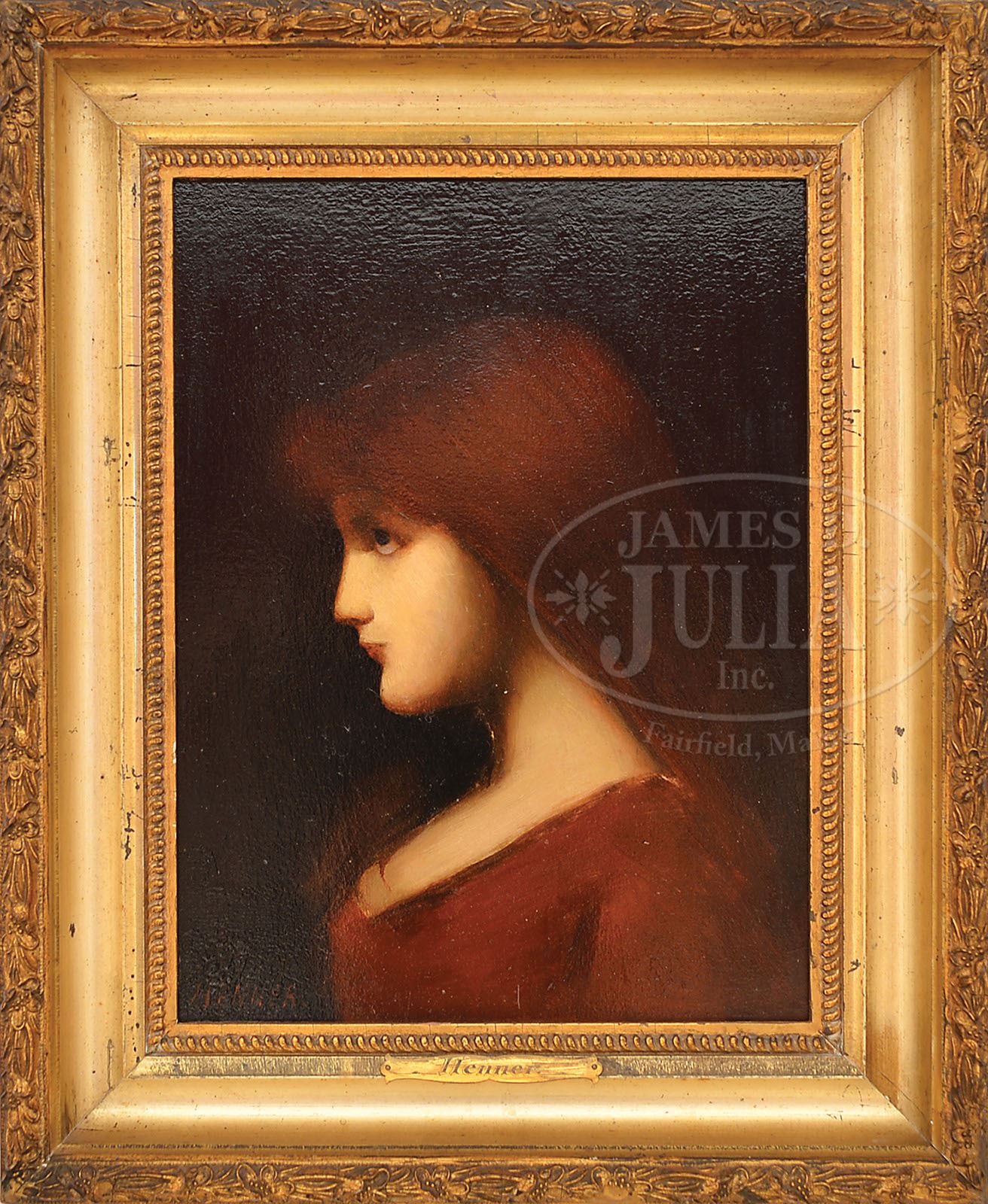 ATTRIBUTED TO JEAN-JACQUES HENNER (French, 1829-1905) GIRL WITH RED HAIR. Oil on wood panel Housed in an antique gesso decorated gilt frame with artist’s plaque Signed lower left “Henner” SIZE: 12″ x 9″. Overall: 16″ x 13″. CONDITION: Very good. 9-90399 (400-800)