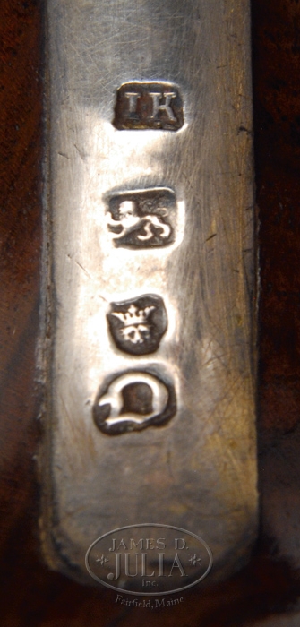 (Correction)Not certain, but may be expert reconversion. One pistol has internal stock repair. SCARCE PAIR OF STERLING SILVER MOUNTED GRIFFIN FLINTLOCK HOLSTER PISTOLS SN NSN. Cal. 65. Beautiful pair of Georgian period pistols with 10” rnd iron bbls with three British proofs at breech ends and marked on top “GRIFFIN-LONDON”. They are lightly engraved with decorative turnings and have an engraved top tang with engraved rnd tail. Lockplates are about 5” x 7/8”, slightly curved with a short teat and have fine border patterns with “GRIFFIN” engraved in front of hammers. They have bridled frizzens with delicate rounded gooseneck hammers. They are mounted with very fine grain English walnut 1-pc stocks with raised teardrop side panels and flared butts. They have fine sterling silver mounts with full hallmarks on toe of bottom tangs. Date stamped indicates silver work was done in 1759 and maker’s mark is believed to be that of John King. They have filigree silver sideplates with delicate foliate patterns and a demon dog head about the middle with a blank panel toward front. Stocks have raised carved, delicate patterns around top tangs and have blank repoussed thumb plates in identical patterns to side plate. Each one has two ramrod guides containing ebony tipped ramrods. Trigger guards have fancy finials with flared trigger bows engraved with leaves & rose blossoms. Buttcaps are heavy oval silver with long decorated langets and a grotesque mask on bottom. Triggers are gracefully curved iron with a small curl at tip. CONDITION: Fine to very fine. Bbls retain a mottled brown patina, thin in breech area on one pistol. Stocks have repairs on each forestock that are very professionally and tastefully done, barely noticeable, with other repairs further down and overall retain a wonderful professionally restored finish. Locks & hammers retain traces of orig case hardening being mostly a smooth gray patina. Silver furniture is partially oxidized with tail of both sideplates slightly lifted and there is a dent in each buttcap. Mechanics are fine. A truly beautiful pair of 18th century pistols that could have seen service with an officer in the Revolutionary War. 4-32835 JR570 (5,000-8,000)