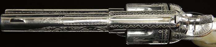ENGRAVED BLACK POWDER COLT SINGLE ACTION ARMY REVOLVER WITH TEXAS HISTORY. SN 150668. Cal. 45 Colt. Nickel finish with 4-3/4″ bbl, 2-line address & cal marking on left side. Left side frame has 2-line 3-patent dates and Rampant Colt in circle. Mounted with beautiful 2-pc smooth pearl grips numbered to revolver. Revolver is engraved by Cuno Helfricht with about full coverage on frame consisting of foliate arabesque patterns with punch dot background. Recoil shield and loading gate are engraved in Mr. Helfricht’s trademark sunburst patterns with snake and dot patterns on top strap. Foliate arabesque patterns extend up both sides of bbl with geometric patterns around the address. Top of back strap is engraved in a beautiful fan pattern with geometric patterns down back strap, on the buttstrap and trigger guard. Cyl is engraved in Mr. Helfricht’s trademark alternating foliate arabesque and sunburst patterns on the lands between flutes. Cyl also has a decorative engraved wavy border pattern near rear edge along with a snake and dot pattern. Screws on frame and grip frame are blued along with a blued trigger and nickel finish hammer. Accompanied by a copy of a Colt Factory Letter identifying this revolver in cal 45 with 4-3/4″ bbl, nickel finish, pearl stocks and factory engraved, shipped to J.C. Petmecky, Austin, Tx, March 22, 1893 in a 1-gun shipment. Mr. Petmecky was a gun maker and dealer in Austin whose shop was in business for over 75 years supplying all manner of arms to local Texans. It is well documented that Mr. Petmecky supplied Colt Revolvers to any number of Texas Rangers, other lawmen, outlaws and many famous figures. PROVENANCE: Don Littman; Robert Howard Estate Collection. CONDITION: Very fine to extremely fine, all matching except cyl which is unnumbered. Overall retains 96-98% strong, bright orig nickel with only slight muzzle edge wear and losses from face of cyl. Cyl shows some light scuffing and wear in one area on the outer diameter. Bottom of bbl and adjacent ejector rod housing are lightly nicked and dinged from careless individuals using a tool to remove the base pin. Screws retain most of their orig blue, moderately faded. Grips have an age line on each side, otherwise are sound and retain great fire and color. Mechanics are crisp, strong bore with light to moderate pitting. Altogether a beautiful Helfricht engraved revolver. 4-45285 JR16 (25,000-35,000)