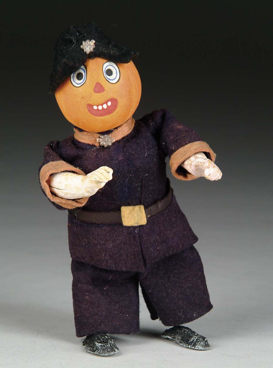 HALLOWEEN MECHANICAL POLICEMAN. Lead-footed figure sways side to side via wind-up action. SIZE: 6 1/2” t. CONDITION: Replaced or repainted head not original to toy; paint very good and toy is working. WP 1-3731 (900-1,200) Auction: Advertising, Toy & Doll - Spring 2005 Please Note: All prices include the hammer price plus the buyer’s premium, which is paid by the buyer as part of the purchase price. The prices noted here after the auction are considered unofficial and do not become official until after the 46th day. |