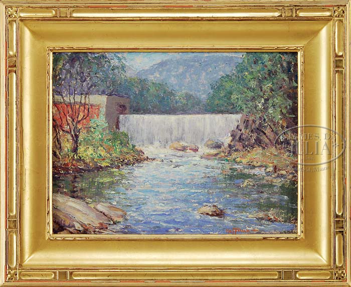 HARRY HOFFMAN (American, 1871-1964) RIVER LANDSCAPE. Oil on masonite shows a man-made dam with waterfall in summer landscape. Trees flank the waterfall with a hill beyond. Signed lower right “Hoffman”. Estate stamped on reverse “#403″. Housed in a gilt carved wood replacement frame. SIZE: 12″ x 16”. CONDITION: Very good. 9-98417 (600-800)