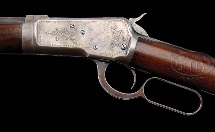 *WINCHESTER M92 TAKEDOWN LEVER ACTION RIFLE. SN 964717. CAL.44-WCF 24″ octagon bbl half mag takedown dove tail Marble #3 front sight, flat top sporting rear left flat of bbl is marked MANUFACTURED BY THE WINCHESTER REPEATING ARMS CO./NEW HAVEN CONN. U.S.A. PATENTED OCTOBER 14. 1884. And under rear sight MODEL92-WINCHESTER/TRADEMARK AND 44 W.C.F. adjacent takedown ring. Standard receiver custom engraved in Winchester pattern of circle with white-tail buck deer, flowing foliate scroll with stippled background and wavy border on left side foliate scroll and stippled background and wavy border on right side. Top and bottom have minimal foliate scroll. Mounted with nicely figured walnut, straight grip, crescent steel buttplate, standard forend with nosecap. PROVENANCE: Herbert G. Wellington Jr. Estate. CONDITION: Fine. Bbl retains 85% original blue with slight muzzle wear, brightening on sharp edges, thinning in chamber area, a few minor nicks and scratches, and rub mark on bottom flat from takedown. Receiver has flaked to a silver blending with brown patina. Hammer retains 50-60% original blue, lever has turned a brown blended with silver patina. Stock is sound with some minor nicks and dings and retains a fine hand-rubbed oil finish. Forend is sound with some minor nicks and dings and retains a fine hand-rubbed oil finish. Mechanics are crisp with a nice shiny bore. 4-38547 BDT220 (2,000-3,000)