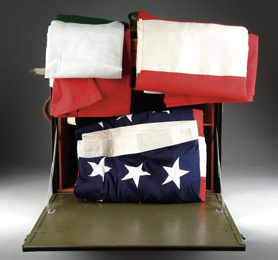 20” x 19-1/2” U.S. FIELD DESK. With three compartments and a drawer inside, containing 5’ x 9’ flag in OB dated 1948. Another flag of Denmark, 4’ x 6’, unused, and an Italian flag of same size, also unused. Also included is a key that works the lock. The lid is marked “U.S. / COI,110th INF.REG. / 28th DIV” and there are also two red keystones painted above this marking. CONDITION: Fine to excellent. From the Collection of the late Barney Frost. 4-53555-51 FS229 (300-500)