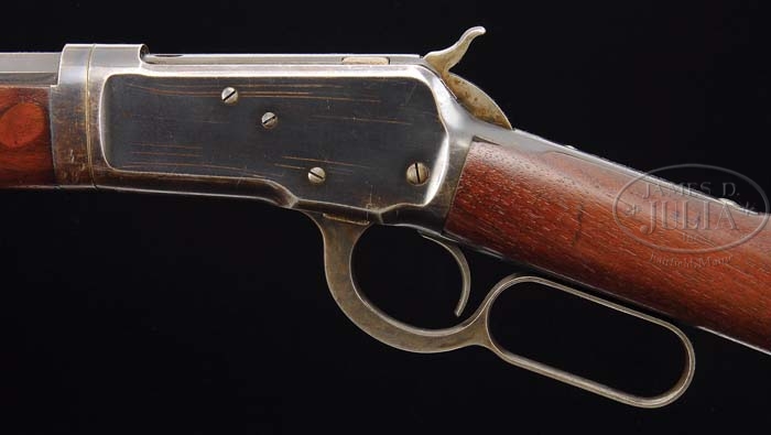 Additional Information: Accompanied by Factory Letter not in description, confirming configuration. WINCHESTER MODEL 92 TAKEDOWN LEVER ACTION RIFLE. SN 20738. Cal. 32 WCF. 24″ oct bbl, full mag takedown, half nickel front sight, serrated side sporting rear with set screw. Top flat of bbl is marked “MANUFACTURED BY THE / WINCHESTER REPEATING ARMS CO. NEW HAVEN. CONN. U.S.A.”, adjacent takedown ring “32 W.C.F.”. Standard receiver mounted with nicely figured walnut, straight grip, crescent steel buttplate, standard forend with nose cap. PROVENANCE: Herbert G. Wellington Jr. Estate. CONDITION: Fine. Bbl retains 70% thinning original blue that is toning towards brown patina. There is a thinned area around in front of rear sight that has had a chemical wiped on it leaving a splotchy brown patina. Receiver retains 70% thinning original blue, thinning at sharp edges and across bottom showing some areas that are lightly cleaned. Hammer retains dark original case colors, thinning on sides. Lever shows dark original case colors blending with silver patina. Stock is sound with small chip upper left side at receiver and lower left side at tang and retains a thin coat of added finish. Forend is sound with minor nicks and scrapes and retains a thin coat of added finish. Mechanics are crisp with a slightly frosted bore and some shallow scattered pitting. 4-38572 BDT229 (2,000-3,000)
