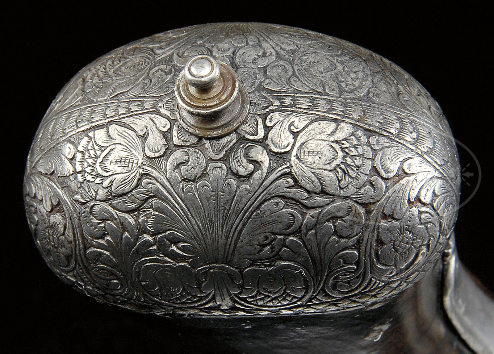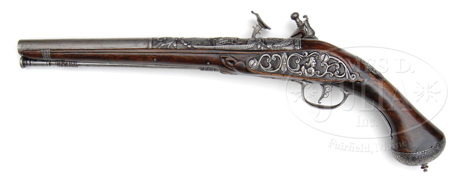 TUSCAN SCHOOL CHISELED STEEL ITALIAN SNAPHANCE PISTOL. SN NSN. Cal. .535 Smooth bore. This unusual gun with full relief chiseled engravings similar to the quality of those by the best Tuscan engravers. Tapered 11″ round bbl has man’s portrait within oak leaves, and group of mounted soldiers besieging castle, surmounted by stand-of-arms. Lock with sliding pan cover is decorated with porcine gentleman’s face. Frizzen is intricately filed with acanthus tendrils and cherub’s face at pivot. Frizzen spring is also nicely filed. Round bodied lock with long teat is fitted with reinforced serpentine cock and is engraved with relief busts and scroll. Another cherub’s face is at pivot of cock. Steel trigger guard has woman’s bust on bow, and man’s at finial with acanthus tip. Side plate is pierced in scroll motif, with another gentleman’s bust. European walnut stock has fishtail butt with acanthus and floral engraved steel cap, and turned finial. Crest plate at top of grip is also deeply scroll engraved with pear-shaped central motif. Turned iron ramrod mounts through filed pipes. CONDITION: Good. Metal surfaces have been cleaned. Wood shows refinish over repairs to grip area and replaced bits of wood. Bbl appears to have been shortened. Engraving of bbl and furniture does not match style of grip cap which is a replacement. Engraving on lock is of excellent quality. 4-42109 MGM219 (3,000-5,000)