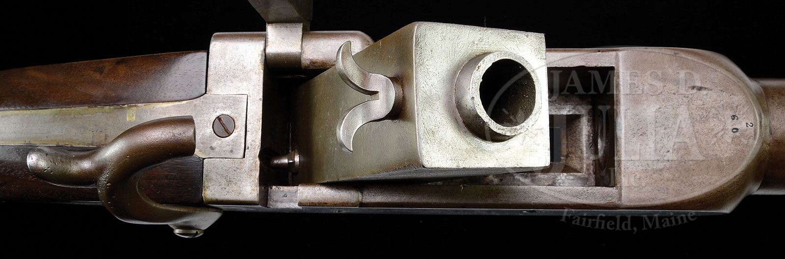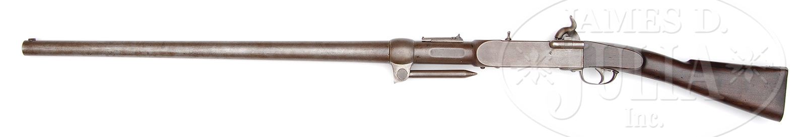 FRENCH MODEL 1842 BREECH-LOADING PERCUSSION RAMPART RIFLE. SN NSN. Cal. .735 Groove diameter. Hexagonal Whitworth type rifling. 39-3/8″ Tapered round bbl has folding swivel mount affixed around breech end with collar. Bbl is mounted with ladder type long range rear sight, and post front. Bbl screws into massive breechloading receiver that has sliding block, which tips up for loading powder charge. When in forward position a large locking lug with folding spring loaded handle, can pivot into place at rear, locking breech. Top of action is stamped “2” and “60”. Rear strap is engraved “Mle 1842”. Back action lock with large serpentine percussion hammer, is marked “Mre Rle de St Etienne”. European walnut straight stock has steel buttplate, and is marked with proof (or inspectors mark) on right side. Weight: 34 lbs 12 oz. PROVENANCE: Barnes Family Collection. CONDITION: Good. Metal parts have silver gray patina overall. Stock is fine, with numerous minor marks. Bore is fine, dark in grooves. Lock is crisp. 4-47661 MGM162 (3,000-5,000)