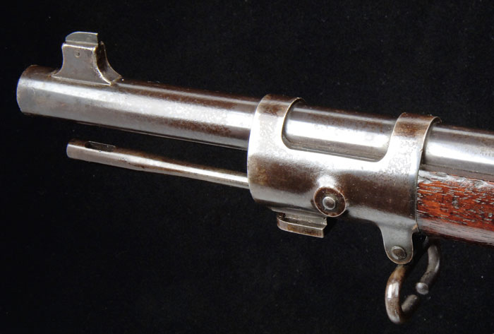 RARE ORIGINAL SPRINGFIELD MODEL 1894 KRAG RIFLE. Cal. 30-40 Krag. SN 4800. Very rare rifle with 30” bbl, pedestal mounted, blade front sight & a 2,000 yard orig ladder rear sight. Mounted in 1-pc walnut stock with split front band & stacking swivel, middle band with sling swivel & a corresponding sling swivel in buttstock. It has smooth, steel buttplate without trap. It has orig wiping rod in a channel in bottom of forestock. It also has an 1894 cartouche on left wrist. CONDITION: Fine. Bbl is a blue/brown patina with traces of blue in sheltered areas and on front band. Sideplate & cartridge box are a thin blue/gray patina and receiver is a blue/brown patina. Stock has a major repair through wrist and comb and overall retains about all of a restored finish with gouges on left side by receiver and normal use & handling marks elsewhere. Mechanics are fine, strong bore, dark in grooves. 4-60688 JR669 (5,000-8,000)