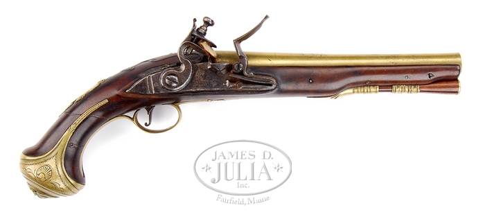 FINE UNMARKED BRASS BARRELED ENGLISH FLINTLOCK PISTOL SN NSN. Cal. 58. Fine, light gentleman’s pistol with 7-3/4” tapered rnd brass bbl, lightly engraved on top with three British proofs on left rear side. Lock is unmarked, 4-3/4” long with pointed tail and two vertical lines behind hammer with a sgl screw behind hammer and an unbridled frizzen with crown shaped tail on frizzen spring and a flat sided, beveled-edge, gooseneck hammer. Mounted in 1-pc English walnut stock with brass furniture having two ramrod guides with orig trumpet head ramrod with brass tip & a worm on small end. Stock has raised side panels with raised carved fan pattern around top tang and filigree sideplate with foliate & floral decorations. It has a blank thumbplate with demon’s head at bottom and a large oval buttcap with long side langettes and a demon’s head on butt. Trigger guard is delicate with a fan shaped finial & flared bow with light engraving. Trigger is serpentine shaped with decided curl at tip. CONDITION: Very good. Brass retains a medium mustard patina, having been cleaned a long time ago and now beginning to repatinate. Stock has a crack near left tip with a couple of others through the grip and is missing some chips around lock. Shows moderate wear. Mechanics are fine. 4-59739(2,000-3,000)