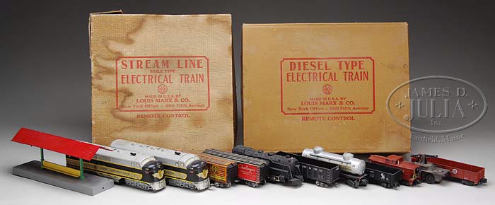 MIXED LOT OF MARX O GAUGE MARKLIN HO AND LIONEL POST WAR, AND AMERICAN FLYER S-GAUGE. 49 pieces in all. Included are two Marx set boxes. Some highlights include a like new American Flyer 982 State of Maine boxcar, nice 970 American Flyer Silver Meteor boxcar, and a nice small 10-piece Marklin HO freight set. CONDITION: Most range from very good plus to near excellent. 1-9011-4, 1-9013-1, 1-9014-1 (400-600) Auction: Advertising, Toy & Doll - Spring 2009 Please Note: All prices include the hammer price plus the buyer’s premium, which is paid by the buyer as part of the purchase price. The prices noted here after the auction are considered unofficial and do not become official until after the 46th day. |