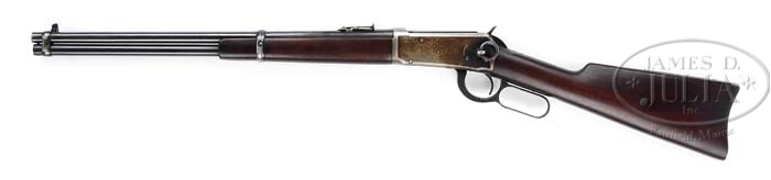 *WINCHESTER 94 SADDLE RING CARBINE. SN 935797. Cal. 32 WS. 20″ bbl with full magazine, square front with pin blade sight, standard carbine ladder rear sight. Left side of bbl behind forend band marked “MANUFACTURED BY THE WINCHESTER REPEATING ARMS CO. / NEW HAVEN. CONN. U.S.A. PATENTED AUGUST 21 1894” with left side under rear sight marked “NICKEL STEEL BARREL / ESPECIALLY FOR SMOKELESS POWDER – .32 W.S.” Standard receiver with stud and ring on left side. Mounted with straight grain walnut, steel carbine buttplate, 9-1/8″ forend with bbl band. PROVENANCE: Herbert G. Wellington, Jr. Estate. CONDITION: Very good, bbl retains 75-80% orig blue, muzzle wear, thinning from front sight back to forend, minor nicks and scrapes and some thinning in chamber area. Front bbl band retains 50% orig blue blending with silver. Magazine tube retains most of it’s orig blue. Rear band has worn to silver on sides with some orig blue across top. Receiver has orig blue in protected area of saddle ring, flaked with brown patina blending with silver patina from wear. Hammer and lever retain good orig blue showing silver at sharp edges. Stock is sound with tiny hairline crack behind top tang, some minor nicks and dings and retains a dark open grain oil finish. Forend is sound with minor nicks, dings and scuffs and retains a dark open grain oil finish. Mechanics are crisp with a shiny bore. 4-38525 BDT130 (750-1,500)