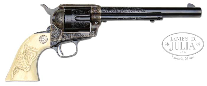 *ENGRAVED FIRST GENERATION COLT SINGLE ACTION ARMY REVOLVER. SN 349941. Cal. 32 WCF (32-20). Blue and color case hardened with 7-1/2″ bbl, slightly altered front sight, 1-line block letter address and cal marking on left side. Left side of frame has 2-line 3-patent dates with Rampant Colt. Mounted with 2-pc silver medallion ivory grips with raised carved ox head on right side. SN was observed on bottom of frame and right side of front and backstraps under the grip. Revolver is engraved by Wilbur Glahn in about C coverage of his distinctive intertwined foliate and floral arabesque patterns with fine punch dot background. He also incorporated his distinctive V-shaped patterns into the engraving on the recoil shield, loading gate, top of backstrap and buttstrap. Cyl is engraved to match with a wavy border around rear edge. Accompanied by a copy of a Colt Factory Letter identifying this revolver in cal 32-20 with 7-1/2″ bbl, blue finish, carved steer head ivory stocks, factory engraved grade 2 and shipped to R.S. Elliott Arms Co., Kansas City, Mo, October 12, 1926 in a 1-gun shipment. PROVENANCE: Richard Garvis (1994); Robert Howard Estate Collection. CONDITION: Extremely fine plus, all matching except cyl and grips which are unnumbered. Overall retains about 99% crisp orig factory finish with glossy blue and brilliant case colors. Grips are sound with a fine mellow ivory patina. Mechanics are crisp, brilliant shiny bore, probably unfired. 4-45290 JR25 (20,000-30,000)